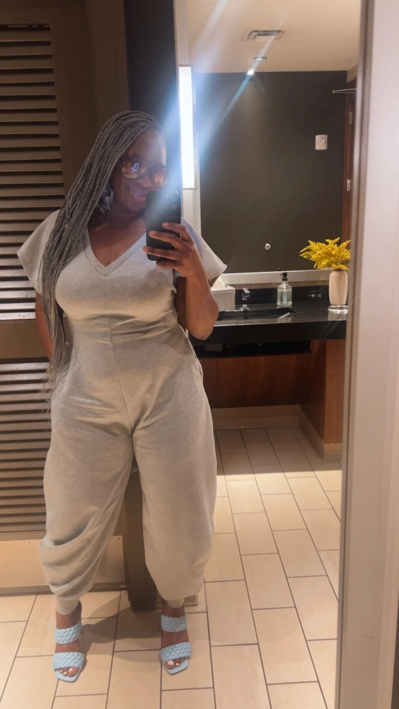 Image 1 of 1 Shades of Grey $43.00 Barrel leg jumpsuit with pockets Size MEDIUM Size: Small Med Large Purchase Added! Barrel leg jumpsuit with pockets Size MEDIUM
